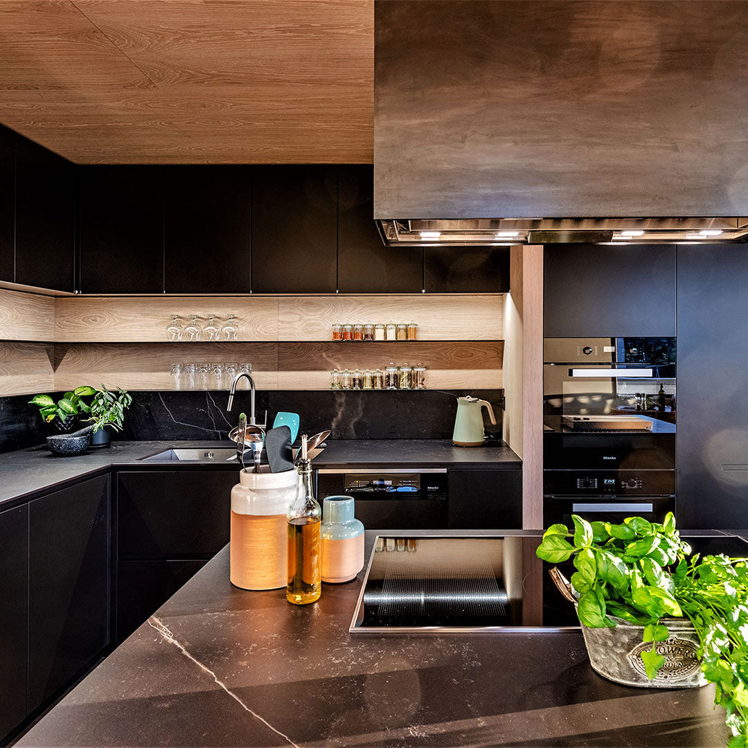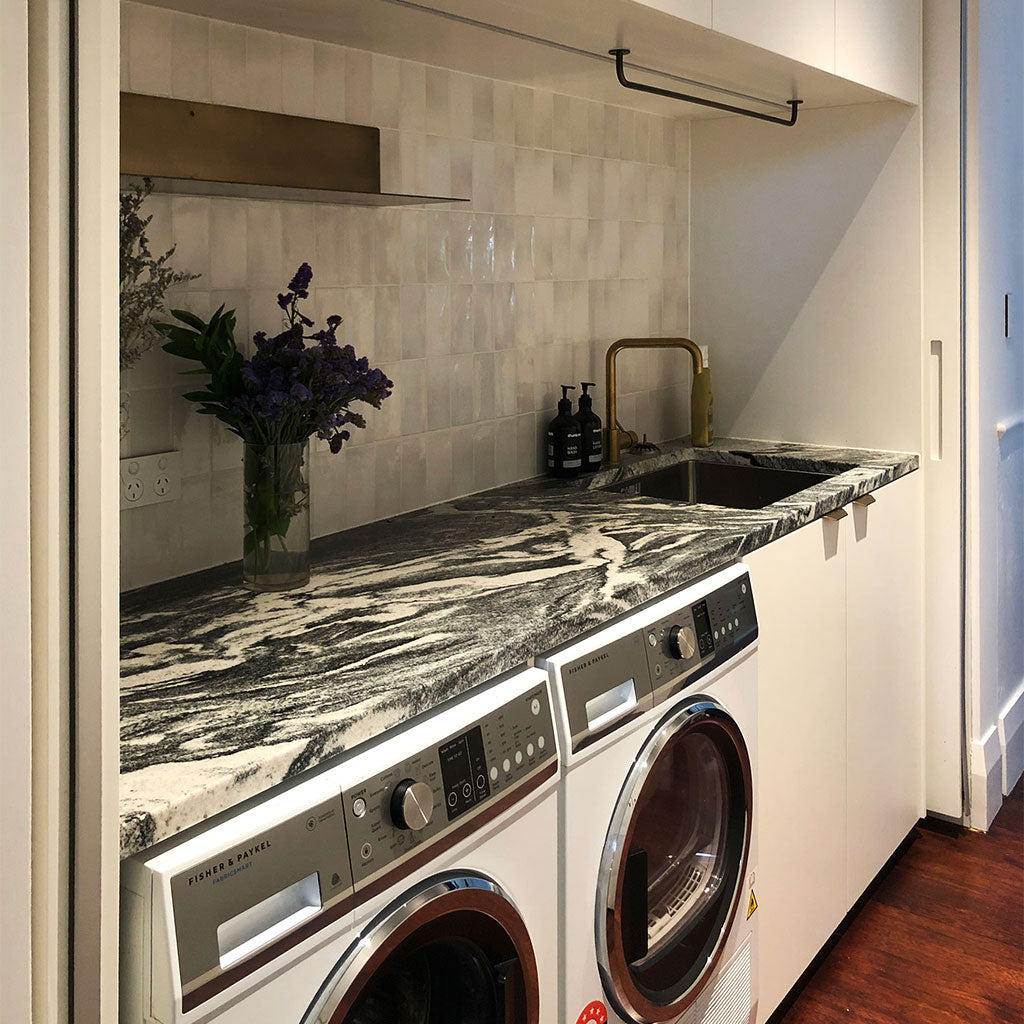 The kitchen features slip matched American White Oak veneer, Laminex Acrylic panels in Meringue, and Silver River Italiano marble benchtops. Expressed divider panels and vertically laid finger tiles add texture and character, while the balance of clean lines and soft curves brings elegance.